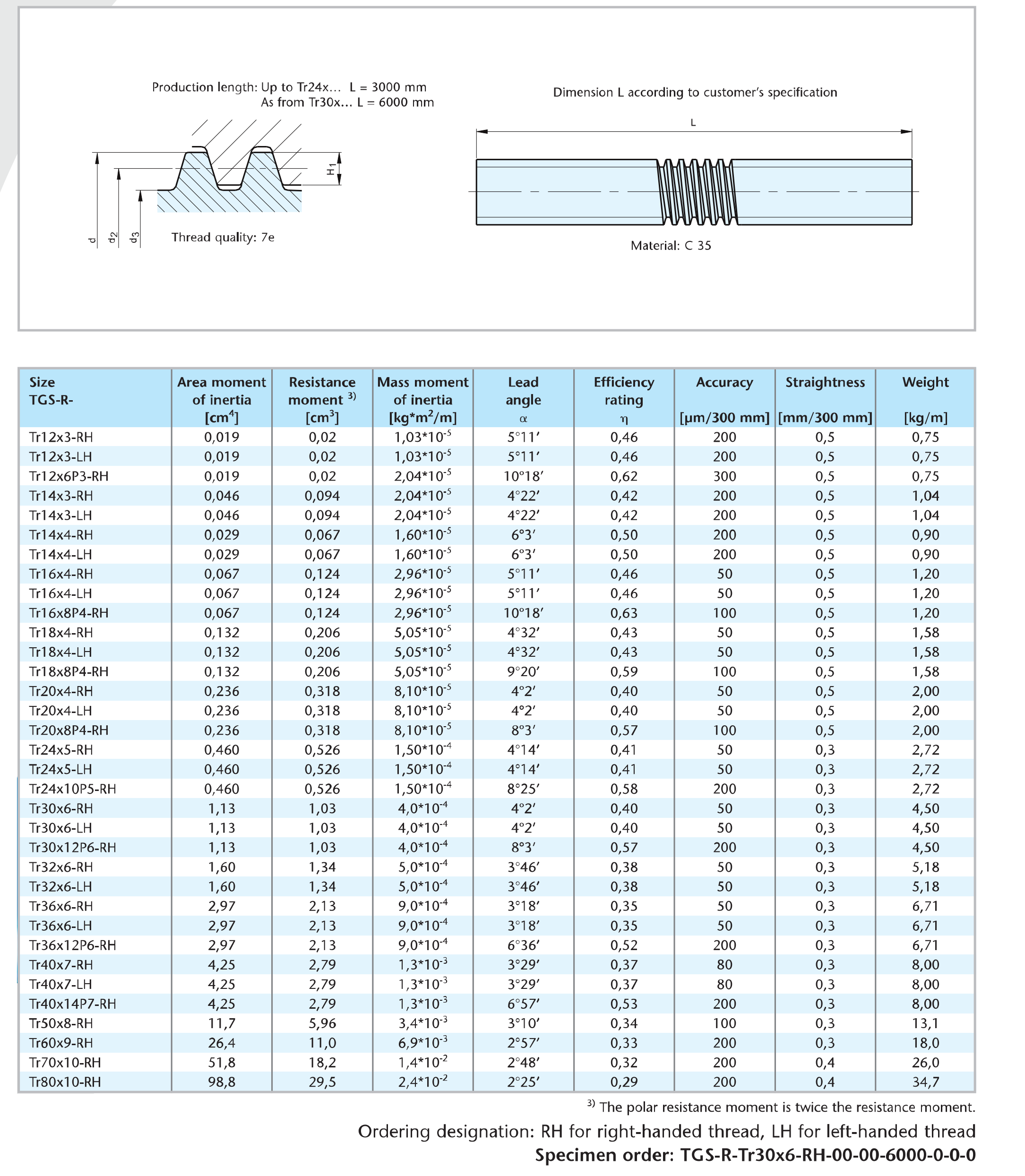 滾動版本: 材料: 線程形式: 標準長度: 端加工: | C 35 (1.0501) 根據 DIN 103-7e 的公制 ISO 梯形螺紋 Up to Tr24x... = 3000 mm As from Tr30x... = 6000 mm 鋸子或根據客戶的規格或客戶的圖紙 |